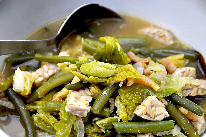 Breng de groenten, ook de groene lomboks die opengespleten en van de pitten ontdaan zijn, in de bouillon aan de kook.