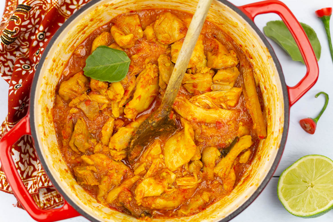 Besprenkel de ajam rica rica vlak voor het serveren met vers limoensap.