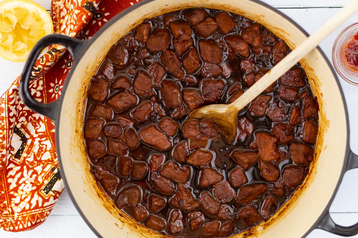 1 tl sambal oelek (optioneel) | Snijd 750-800 g hamlappen (of ander varkensvlees) in hapklare stukken en bestrooi rondom met peper en zout.