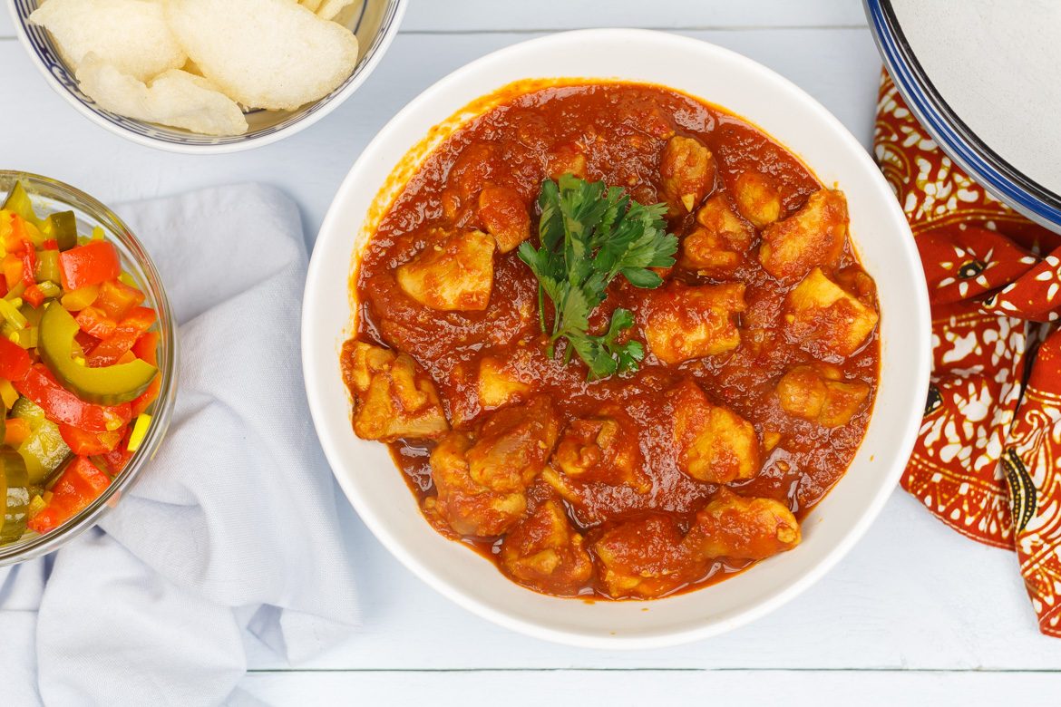 Schep de gebakken stukjes kip door de boemboe tot alles bedekt is.