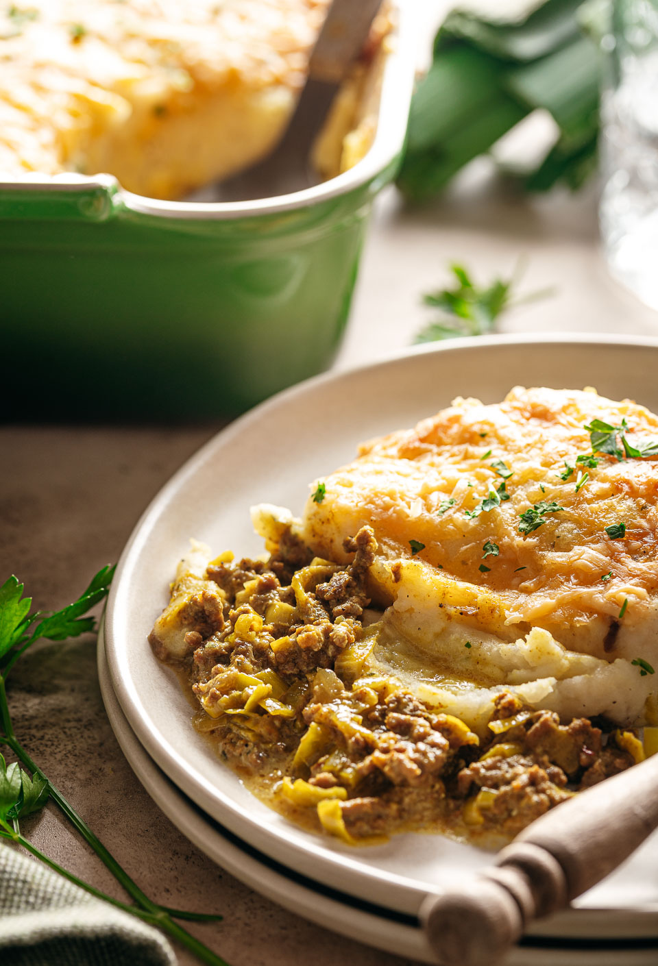 Giet hierover het roommengsel en verdeel daarover de aardappelpuree.