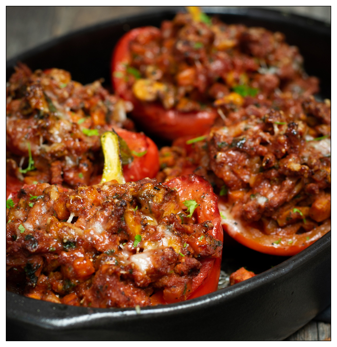Druk de vulling hierbij goed aan binnenin de paprika, maar schep de bovenste vulling er losjes bovenop.