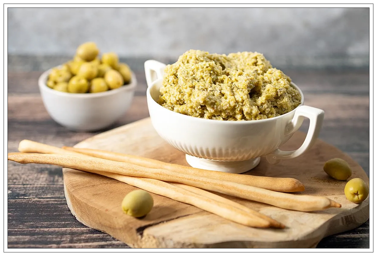 Maak de tapenade op de gewenste dikte met het opgevangen vocht van de olijven.